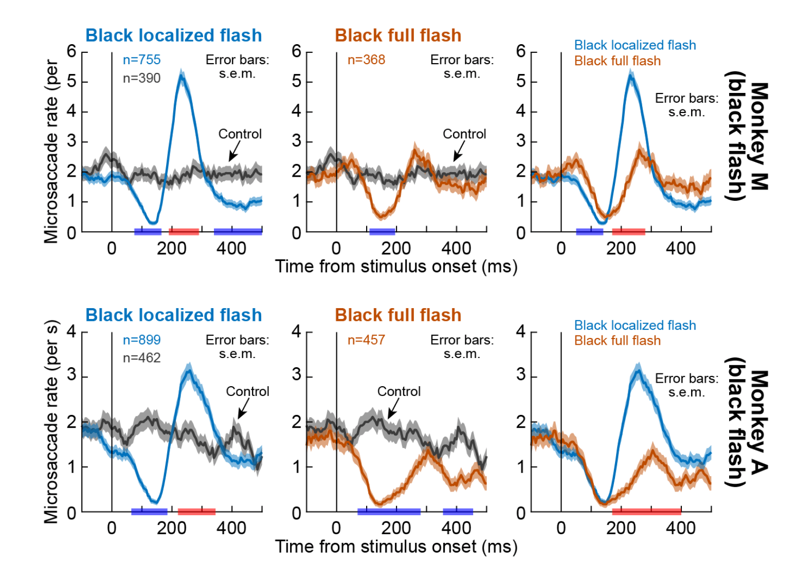 In this new paper, we show some intriguing modulations of microsaccade rate (the rapid reduction in microsaccade frequency followed by a stronger rebound phase of high microsaccade rate) following the presentation of brief visual flashes consisting of large or small white or black stimuli. First, we show that small stimuli are the only one to cause a rebound after microsaccade inhibition. With large stimuli, the post inhibition period resulted flat. But more interesting, we show that small black stimuli were always associated with stronger modulations in microsaccade rate compared to white stimuli. Such difference was particularly evident in the post-inhibition rebound phase of microsaccade rate.