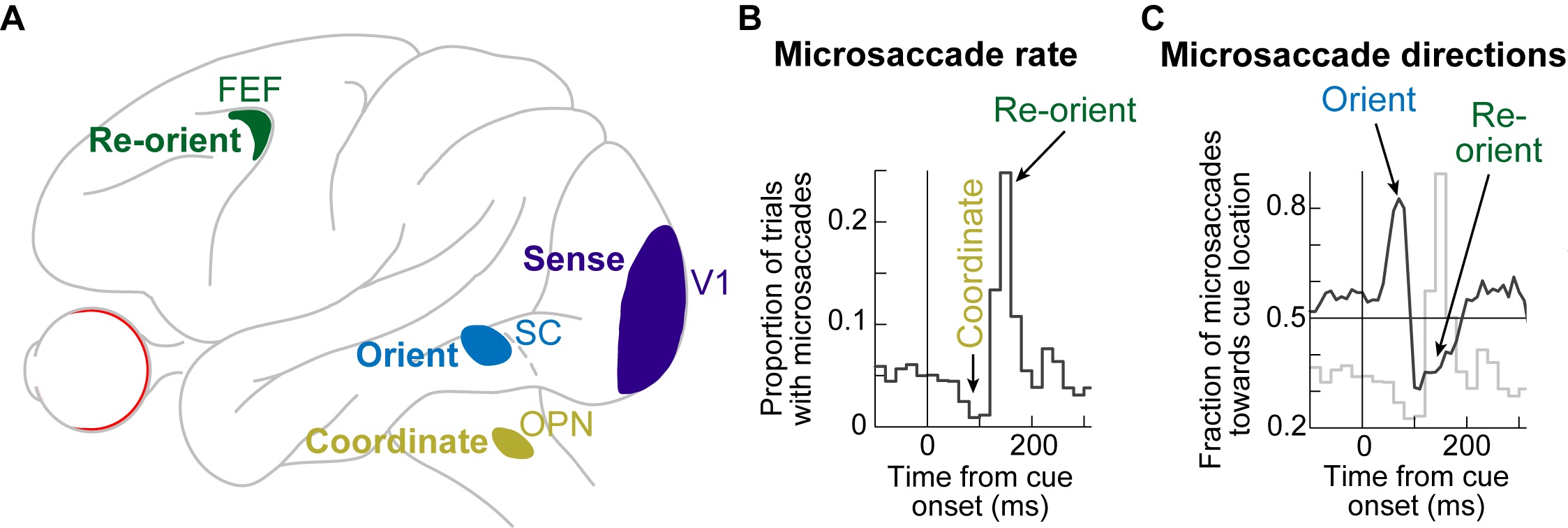Our main hypothesis is that the early reflexive microsaccade effects observed soon after the presentation of a visual cue arise subcortically, downstream of the superior colliculus (e.g. brainstem), while the cortical areas such as the frontal eye fields are more involved in the reprogramming of these inhibited eye movements.