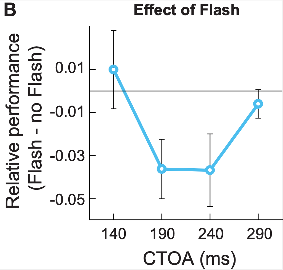 In the original version of the manuscript, we reported an inhibitory effect of a visual transients during a covert orienting task requiring discrimination of a tilted gabor. The inhibitory effect was taking place only at specific time intervals after cue onset, with greatest interference during reorienting behavior, 190 to 240 ms after cue onset.